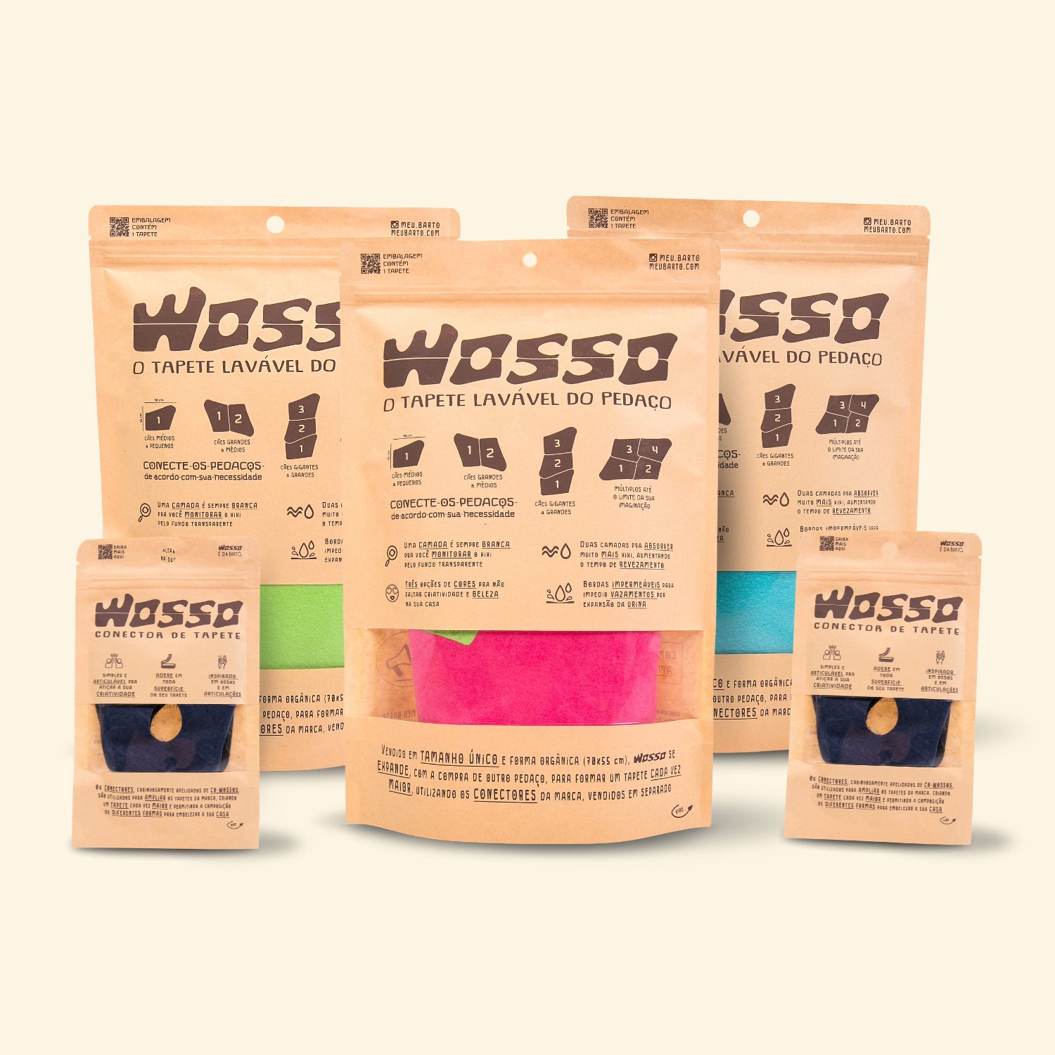 Inclui 3 tapetes WOSSO: Rosa, Azul e Verde